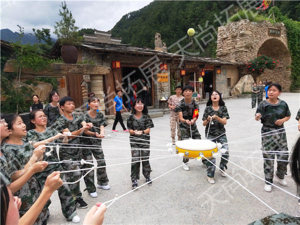 游戏规则:10人一组 用绳子拉起鼓面然后利用鼓面使网球不断弹起,弹起的次数越多即为获胜组,这需要团队间的高度配合,大家都非常仔细的操作着这个鼓面,争取自己的团队能够成为胜利组!